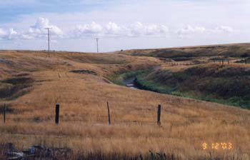 The Rush Lake Irrigation Project commonly referred to as the Rush Lake flats or the lake is 5868 acres (2376 hectares) of flood irrigation. The lake at Rush Lake was drained to facilitate the construction of the CPR railway through it to create a more direct route as the railway originally went around the north side of the lake. In the 1950’s the PFRA started construction of an irrigation project that would use water stored at the newly constructed Duncairn Reservoir. Approximately 3,200 acres north of the CPR railway which bisects the project were constructed using the border dyke system of irrigation, this area of land is often referred to as the Intensive Irrigation portion of the project. This had been successfully used in other areas, including Eastend on the Frenchman River system. This consists of levelling the land and creating parallel dykes, 15 cm high at about 15 meter intervals to contain the water as it moves downslope. This resulted in increased forage production, reduced labor and fuel costs compared to pumping and sprinkling water onto the land, however it also means less efficient water usage. The other 2,600 acres which are south of the railway are irrigated using back flood irrigation. The “Southside” is irrigated in early March when run-off from the Rush Lake Basin is blocked from entering Lizard Creek and then spreads over the land to irrigate it. Once the land has been covered or there is no more water flow in, the water is released to Lizard Creek and eventually ends up at Reed Lake in Morse. Excess water from the North side irrigation also flows to Lizard Creek. Some of the land on the east side of the project north of the railway tracks can be either back flooded or intensively irrigated.